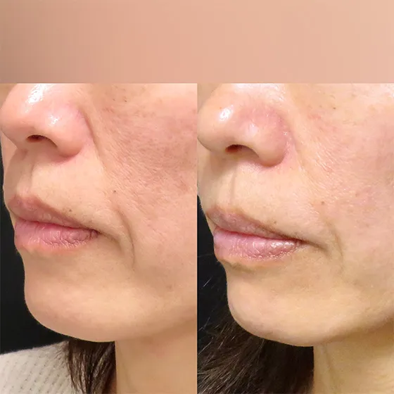 施術名:PRP注射プレミアム(頬)/施術の説明:深い溝となった頬のくぼみに注入することで、お顔のボリュームをふっくら若々しく整えることができます。/施術の副作用(リスク):内出血や腫れを生じることがあります。