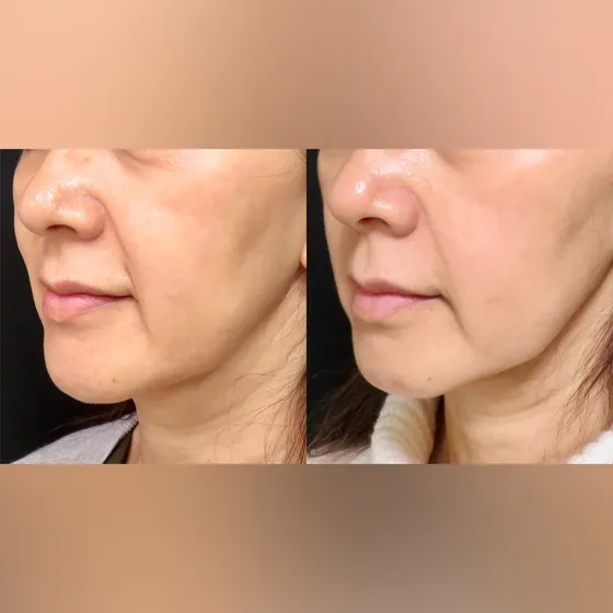 施術名:PRPコラーゲンリフト(60本)/施術の説明:PRPを含んだコラーゲン吸収糸をフェイスラインや頬、顎下に挿入することで、コラーゲンがW (ダブル) 産生され、引き締まった輪郭になります。/施術の副作用(リスク):内出血や腫れを生じることがあります。