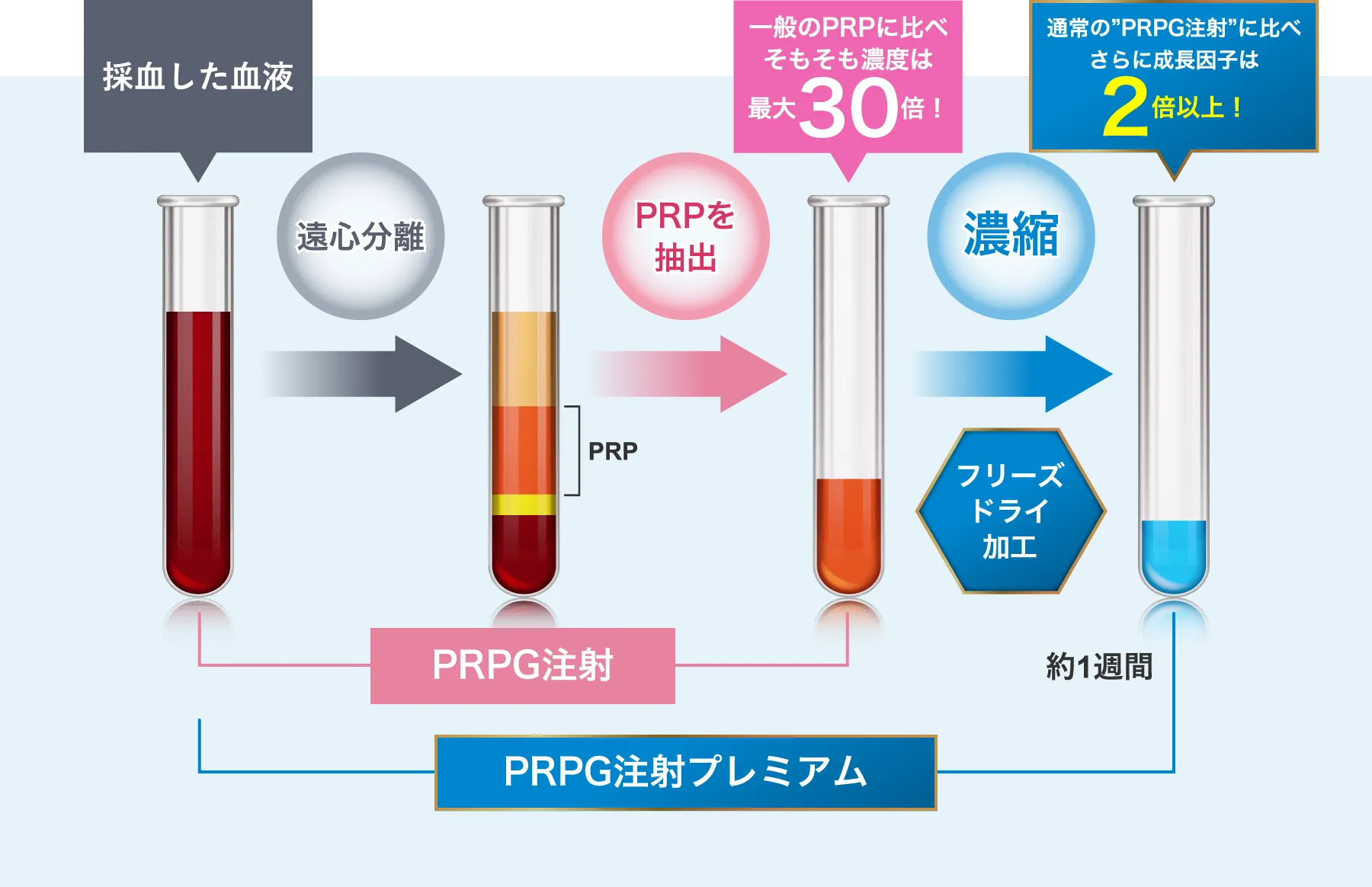 PRPG注射プレミアムとは、高濃度PRPをさらに「フリーズドライ化」し、成長因子を極限まで濃縮した究極のPRPです。